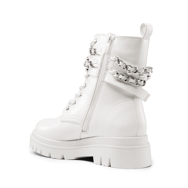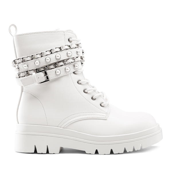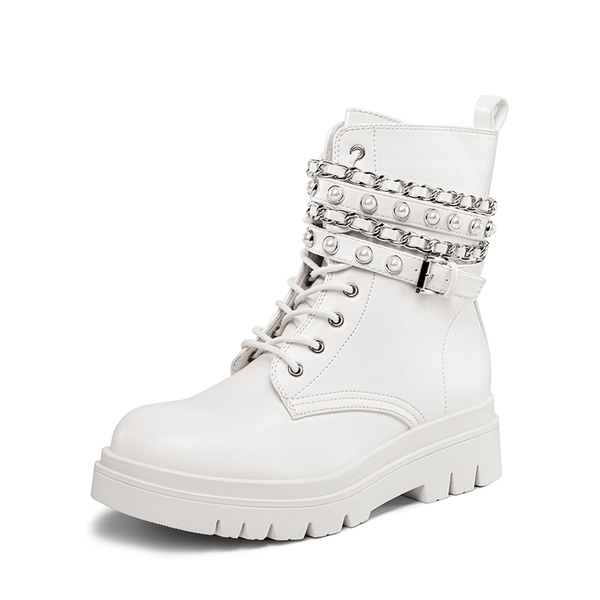 - Punk Style: These chunky lug sole ankle boots are embellished with silver chains & pearl-studded straps, making them perfect for those who want an edgy style with added glam.
