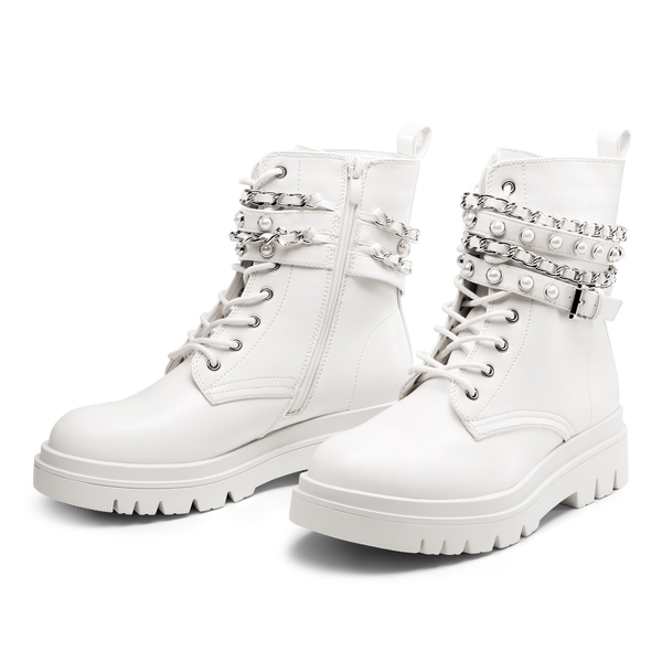 Show off your attitude with our punk styled chunky lug sole boots, embellished with silver chains and pearl-studded straps. Including a smooth side zip and comfortable latex insoles.