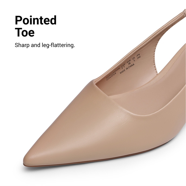 A clean slingback line, a pointed toe, and a gentle kitten heel—easy elegance for the days you want to look polished without the effort. Designed to move with you from office hours to evening outings, these heels add a quiet lift to whatever you wear. Perfect for moments when subtle style makes the outfit.