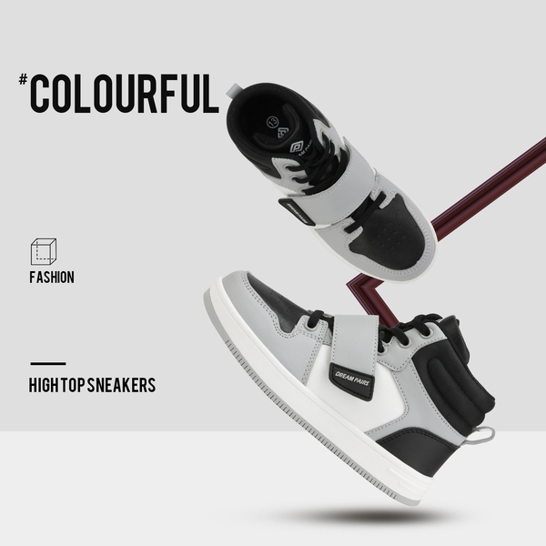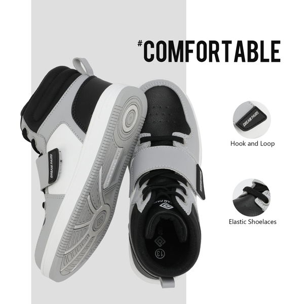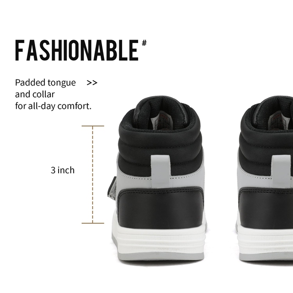 Grab a pair of high-top style shoes for your kids. Our kid's high-top sneakers are easy to put on with elastic laces and hook-and-loop closure. The padded tongue and collar offer added comfort. Enjoy ankle support with the high-top design. These sneakers for kids feature a durable rubber flocking coating outsole for better grip on various terrain. A perfect option for daily activities.