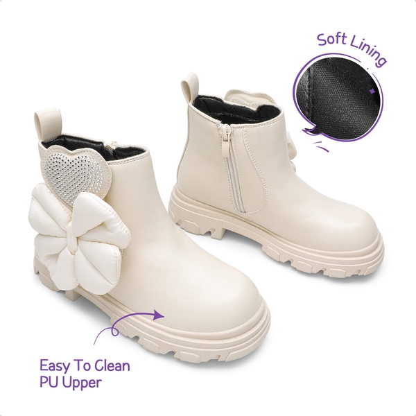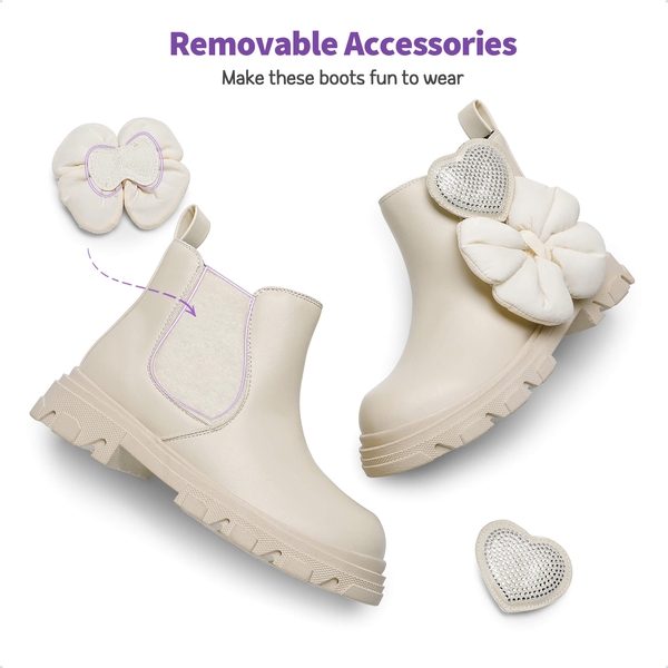 Stylish, comfy, and easy to wear. These customizable boots for girls meet all your needs. Spark your kid's imagination with the hearts and bows removable accessories, while the side zipper enables independent on-and-off. Enjoy all-day comfort with the soft insole and lining which makes these boots a delight to wear.