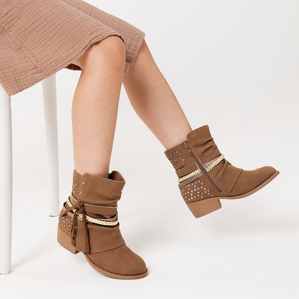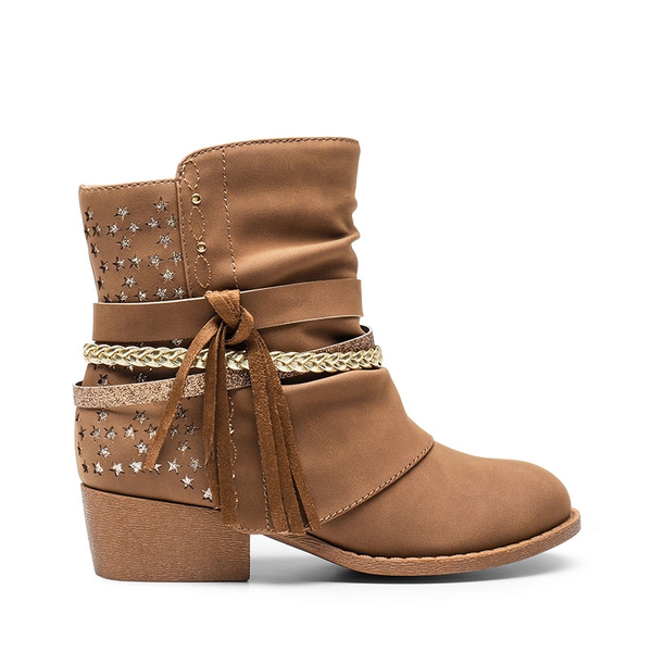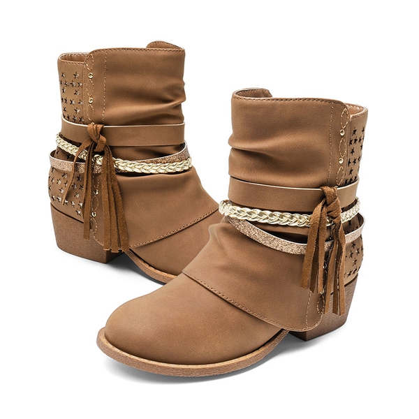 Elevate her style with these girls’ ankle boots adorned with tassels, strappy details, and carved star patterns on the upper that add a fashionable flair to her ensemble. An inside zipper ensures effortless on/off. These boots come in both black and brown and are a wonderful gift for your girl.