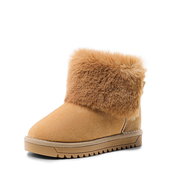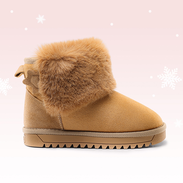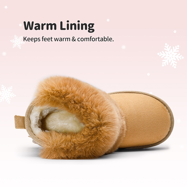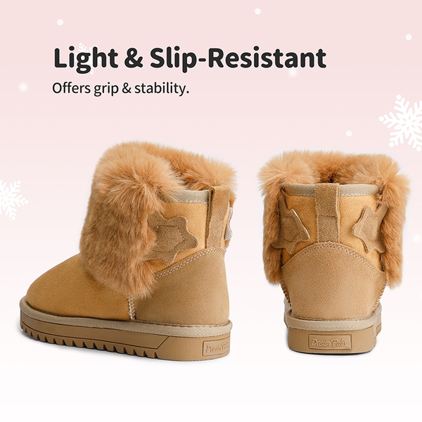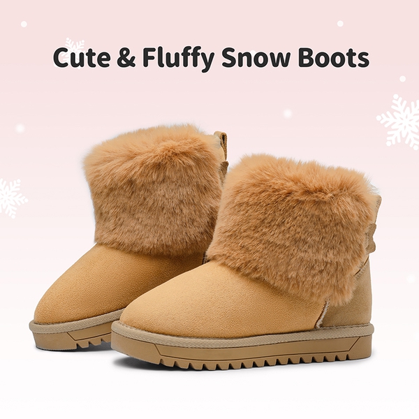 Going out in the snow is always fun with these kids ankle snow boots, made with textured and slip resistant sole that provides stable footing in the snow and ice. These snow boots for kids are finished with fluffy faux fur lining that provides a warm and cozy feeling for little feet in the cold weather. These kids snow boots have a smooth suede upper that is complemented visually with a suede star and fluffy pom-pom to give your child a cute and stylish appearance, finally these shoes are effortless to wear thanks to it's slip on design and pull tab on the back.