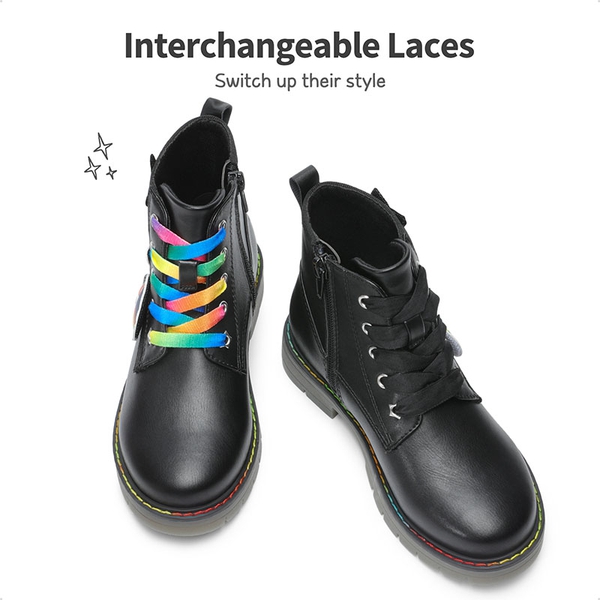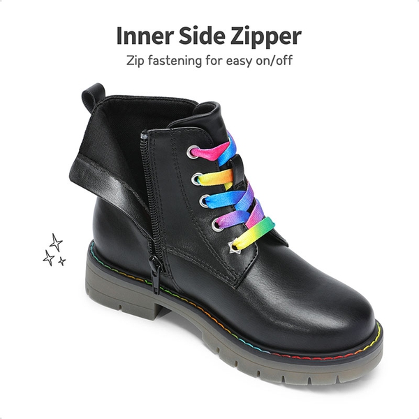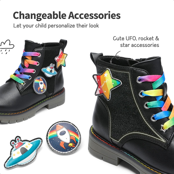 These girls’ glitter combat boots come with UFO, rocket, and star-shaped accessories, complete with colorful interchangeable rainbow laces. Your girls will have a blast customizing their boots! The anti-slip rubber outsole ensures safety and reliable traction during play or walks. Encourage their creativity and individuality with these stylish lace-up boots.