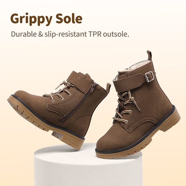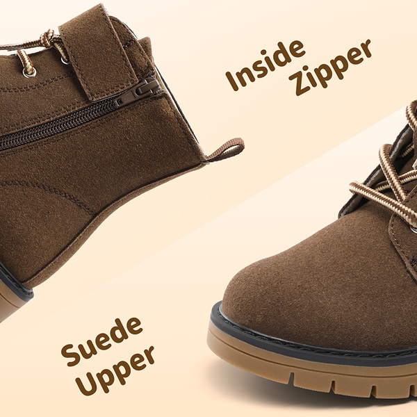 Jump into action with these kids suede combat boots, including a 100% suede upper with a timeless silhouette, complemented with a buckle strap for fashion that is practical for children. These combat boots for kids feature an anti-slip sole that is grippy and adds traction to each step. They also come with inside zippers and pull tabs for easy on and off. These boots also include a warm lining, perfect for wearing during fall and winter to stay warm and cozy.