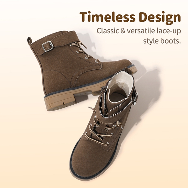 - Lace-up Design: These kids’ boots have a timeless silhouette and are complemented with a buckle strap that is fashionable and practical for children.