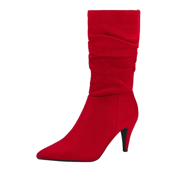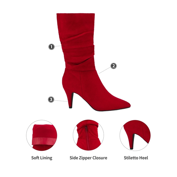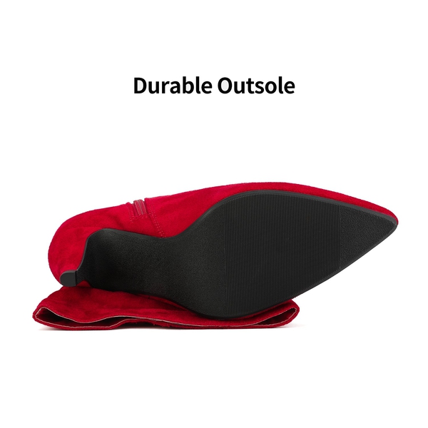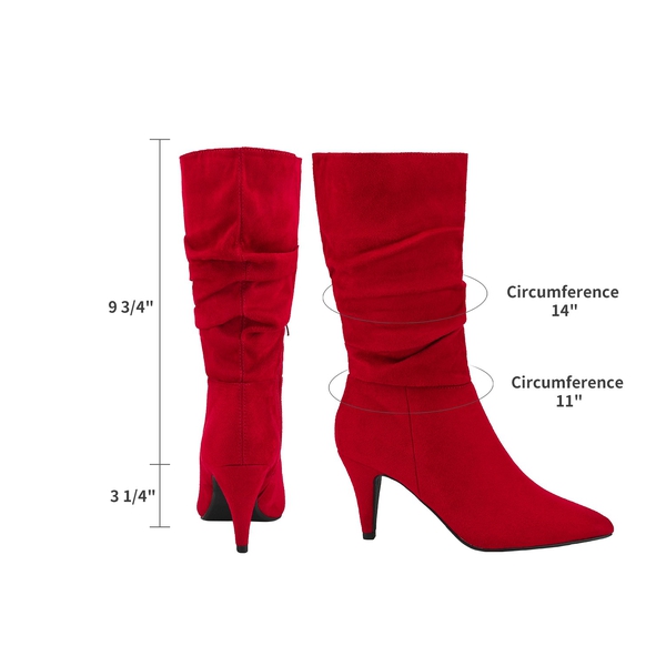Feminine qualities with a sturdy fit. The PVC sole used for these mid-calf high heel boots is marvelous and supportive. Our mid-calf pointed-toe boots reflect a minimalist but sizzling design. The material is man-made and the heel rests comfortably at 14" in the sky.