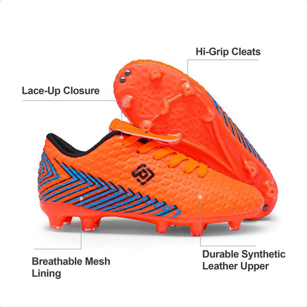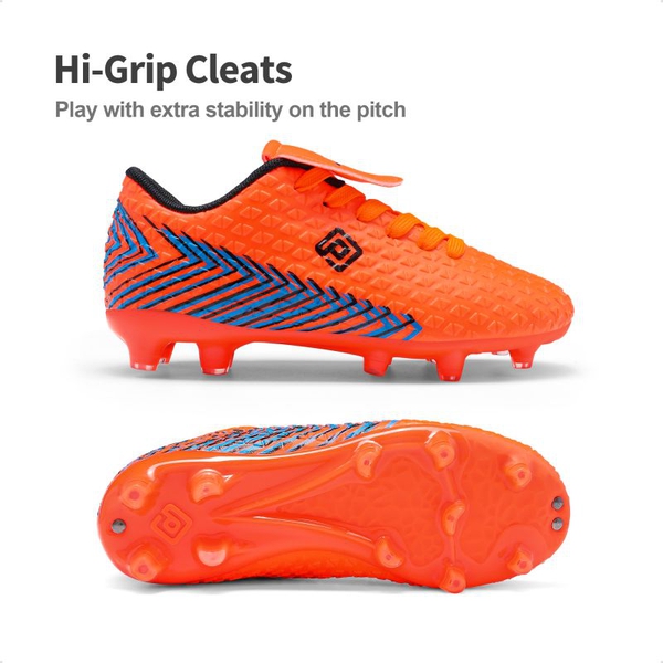 Our kid's soccer cleats are effortless, gliding through the field and toward victory. It's time to settle into more supportive footwear. Find game-time focus. Then, experience superior grip. A hardened TPU outsole and a fold-over tongue for extra protection during high-speed chases. Our boys and girls soccer cleats set up your budding athlete for that very-deserved win.