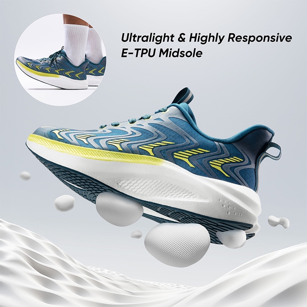 Lightweight Responsiveness: An ultralight E-TPU midsole, made from sustainable materials, stays durable and highly responsive whenever you’re ready to accelerate.