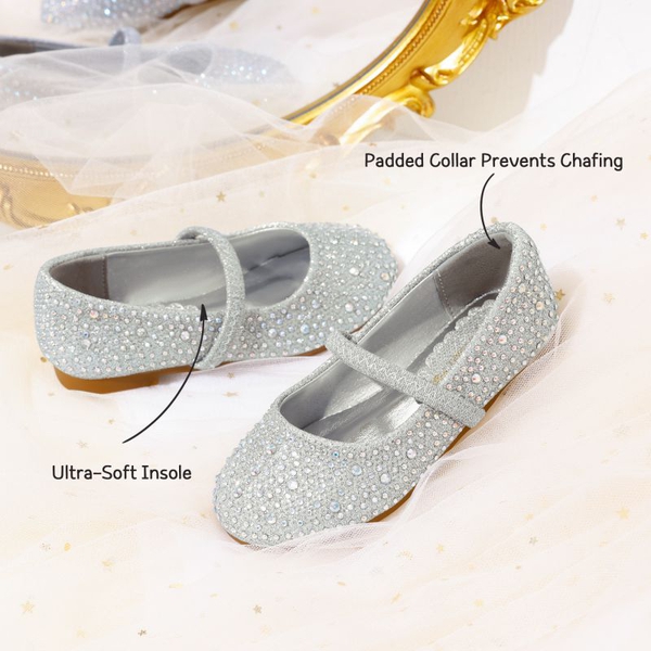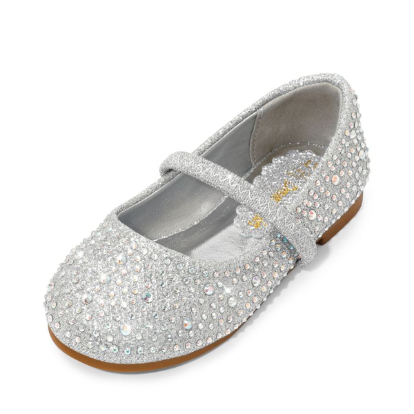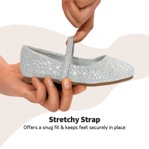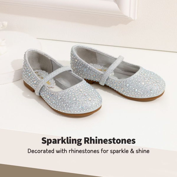 Shine bright like a little diamond-soon-to-be-star. Incredibly dazzling lightweight and breathable girls rhinestone flats. The pearl and rhinestone strap serves as the perfect embellishment. The lightly padded footbed is comfort redefined. Make purchasing these flats a priority for relaxation and style.
