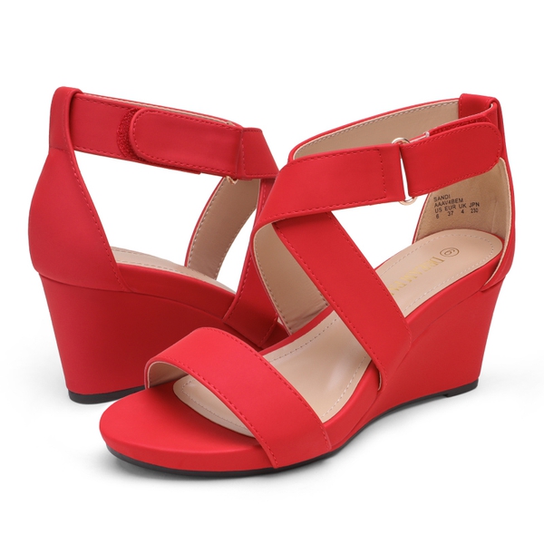 Pick a premium latex cushioned footbed for ultimate comfort. It's easy and breezy like the feel of these lightweight straps, with a criss-cross at the ankle for an edgy modern design. We are in love with the look of these elastic strap wedge sandals and we know that you will be too. Streamline this look with a black pinstriped blazer and jeans. There you have it. The perfect look. Our women's elastic ankle strap wedge sandals never disappoint.