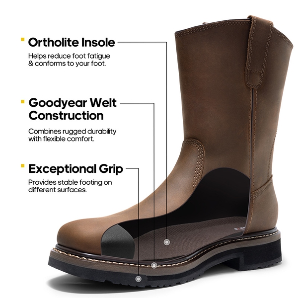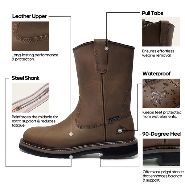 Experience durability and comfort with these men’s work boots. Featuring a robust steel toe for protection, advanced waterproofing to keep your feet dry, and premium water-resistant leather for long-lasting wear.