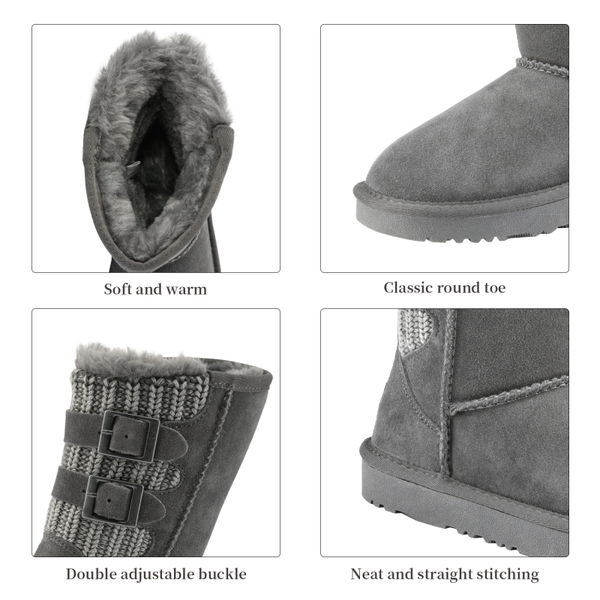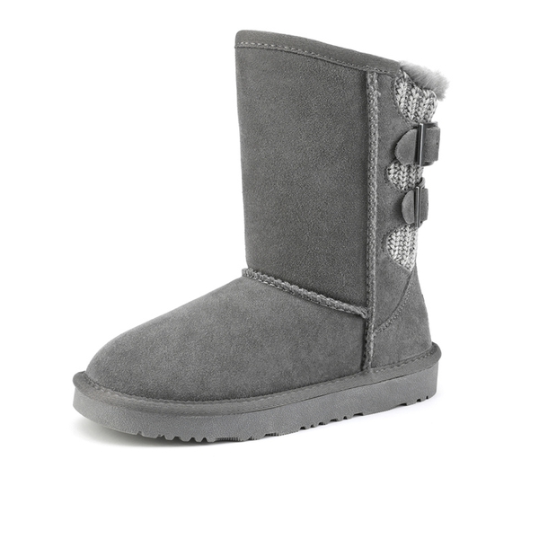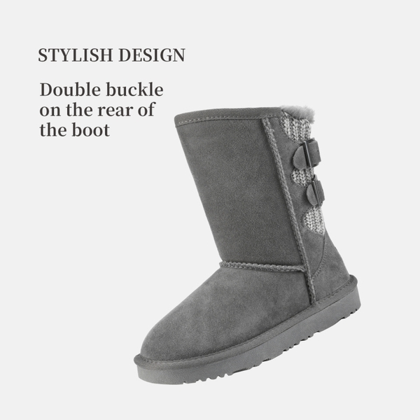 This is a classic style with a promising twist. Take the world by storm with double buckled back. Sheepskin lining and anti-slip outsole for superior traction. Our kids snow boots fulfill all your wishes for a perfect fit. Take this classic round toe and mid length kids snow boot out for a whirl.