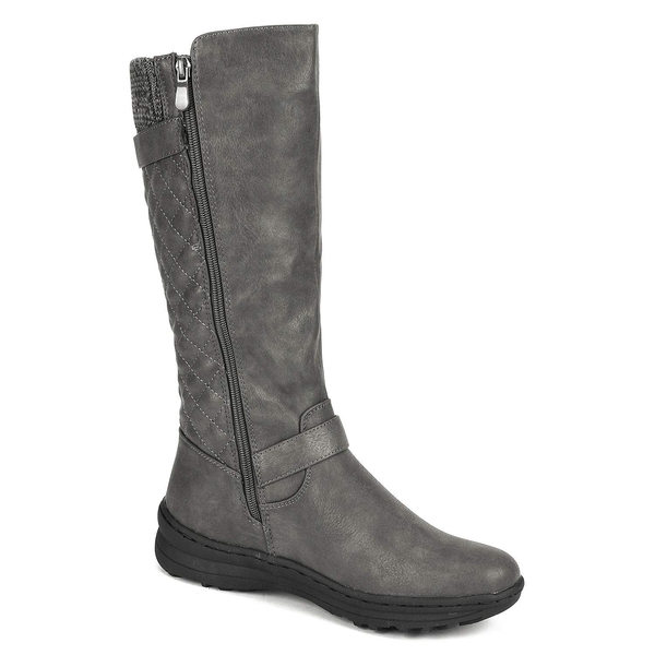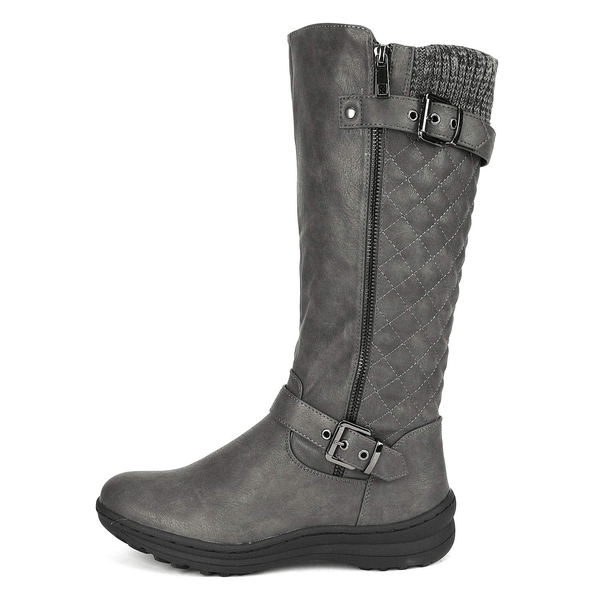 Quilted knee high boots that provide quality beyond compare. A real stellar kind of boot, that stands up to the competition and leans up against anything in your way. Decorative diamond quilting backed with fur lining and a smooth PU leather. Need more, save more with our women's faux fur knee-high boots.