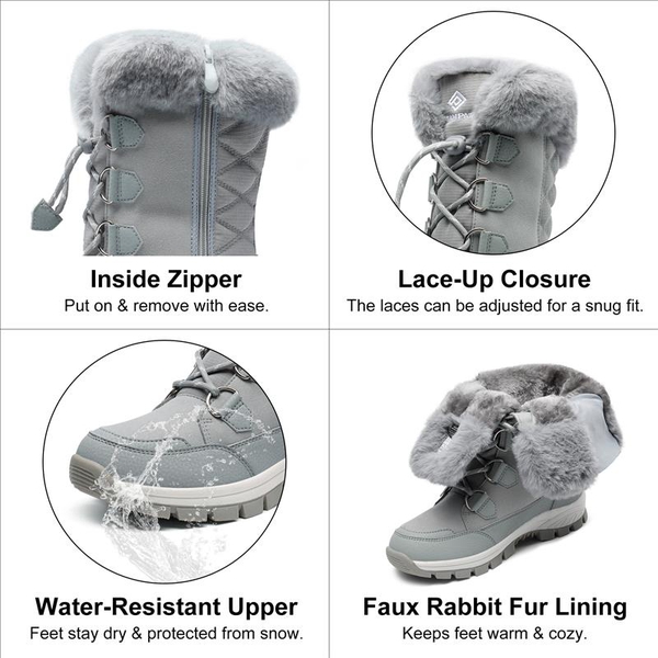 - Lace-Up Closure: The laces can be adjusted for the perfect fit to keep out the cold and the snow. The mid calf boots can be adjusted for a snug fit & help keep out the wind and snow.