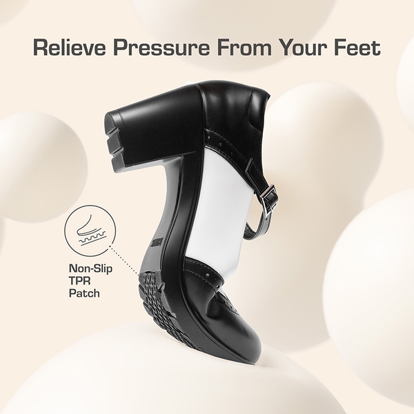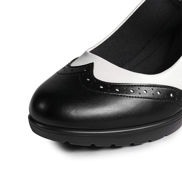 The sleek vamp and brogue details are reminiscent of formal dress shoes, while the retro-inspired Mary Jane silhouette lends an air of understated elegance. These chunky heel Mary Jane pumps feature a cushioned insole with arch support and a walkable chunky heel, ensuring your feet stay comfortable and supported all day long.