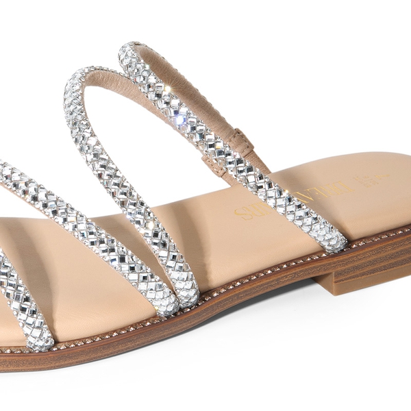 Smooth Footbed: Crafted with a faux suede-covered footbed and complemented with an edge that is adorned with studs, these rhinestone slide sandals add a touch of glamour to any outfit.