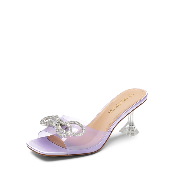 Step out with confidence and style in these fabulous clear-heeled mules. Highlighted with a retro square toe that gives these heels an elegant touch. The double-layer rhinestone bow gives these heels some bling factor and sparkles with every step. Choose from satin and clear strap options for a super chic look.