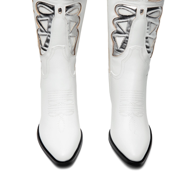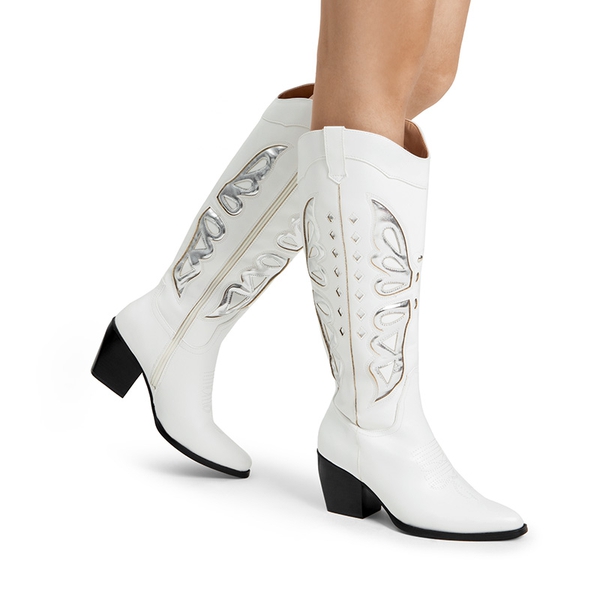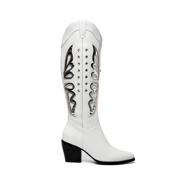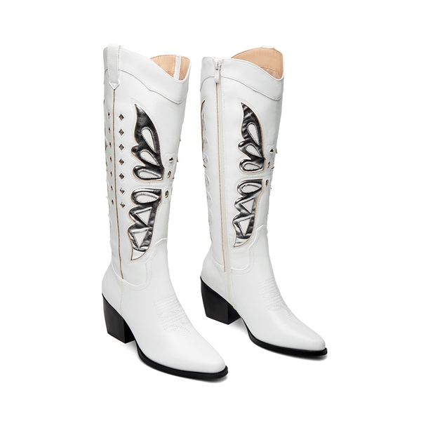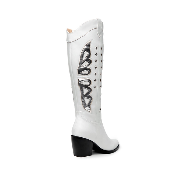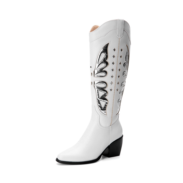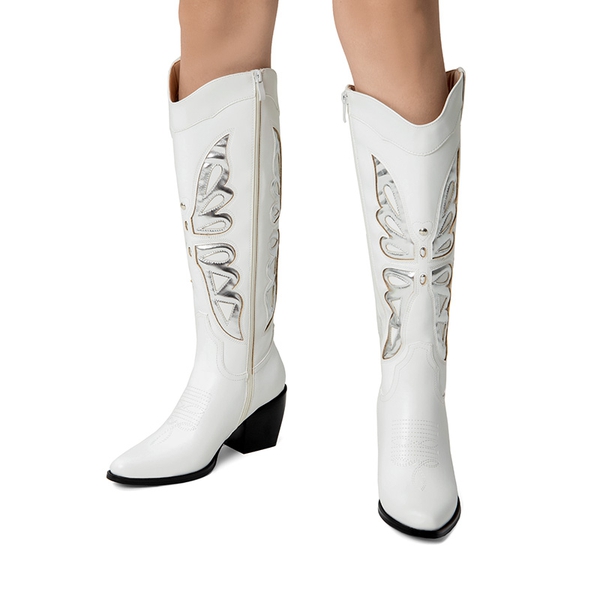 Look and feel special in these knee-high boots for women! Featuring a V-shaped topline and silver butterfly wing patterns, these boots will take your style game to the next level. Comfort is also a priority with these boots, complete with a 4mm latex insole and a sturdy cuban heel. Enjoy easy on-and-off with the inside zipper closure.